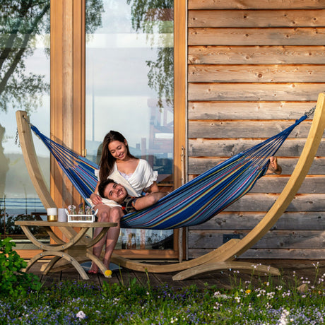 There are numerous options for fixing and suspending a hammock, each providing a unique and enjoyable experience. You may choose to hang it between two generously spaced trees with our adjustable fixing ropes, place it on one of our robust stands, or securely fasten it to walls or posts. For those with only one tree in their garden, we even offer a specialized stand designed to accommodate such situations.