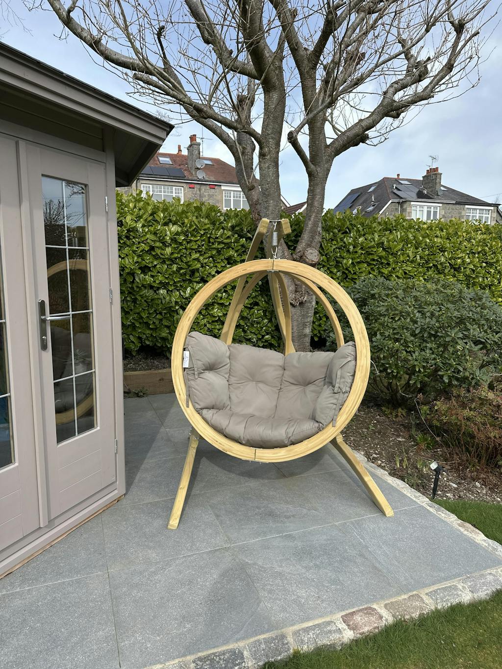 The Globo Single Egg Chair Stand is a handcrafted wooden frame designed specifically for the AMAZONAS Globo Single hanging chairs. This distinctive stand allows you to enjoy your egg chair at any location – indoors or outdoors – without needing trees, ceilings, or wall fixings.